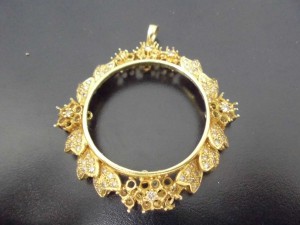 こんにちは。千種区の大吉星ヶ丘店のCです。続いてのご紹介はダイヤ付の金の枠のお買取りです。この前に紹介した金貨の枠です。周りにダイヤが付いているのがお分かりでしょうか。ダイヤ自体は小さなものですが合わせるとかなりの量になります。買取専門店大吉星ヶ丘店では小さなダイヤにもちゃんと査定して高価買取をしております。大きなダイヤの高価買取は当然ですが小さなダイヤも高価買取は大吉星ヶ丘店の自慢です。星ヶ丘駅からすぐの大吉星ヶ丘店へお越しください。【 買取専...