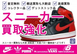 浜松市の皆様こんにちは!浜松駅から徒歩3分、高価買取専門店大吉浜松店のスタッフ松本です!ここ最近、大吉浜松店にて買取が急増しているスニーカー『スニーカーのブログみました!』という、新規ご来店のお客様も多く、厚く御礼申し上げます特に多いのがナイキ(NIKE)のスニーカーやバッシュ(バスケットシューズ)人気のエアジョーダン(AIRJORDAN)をはじめとするバッシュ、スニーカーとしても最適なエアマックス(AIRMAX)やダンク(DUNK)などなど大吉...