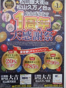 みなさま、こんにちは!愛媛県松山市の銀天街商店街内で営業をしております!買取専門店大吉松山銀天街店です(^▽^)平素より格別のご愛顧をいただきまことにありがとうございます!誠に勝手ながら、12月29日(月)~1月3日(土)の期間、休業とさせて頂きます。年明けは1月4日(日)10時より通常営業致します。皆様のご来店を心よりお待ち申し上げておりますm(__)m無料査定で初めての方も安心!価値があるか分からない物など気になるものがございましたら是非、ご...