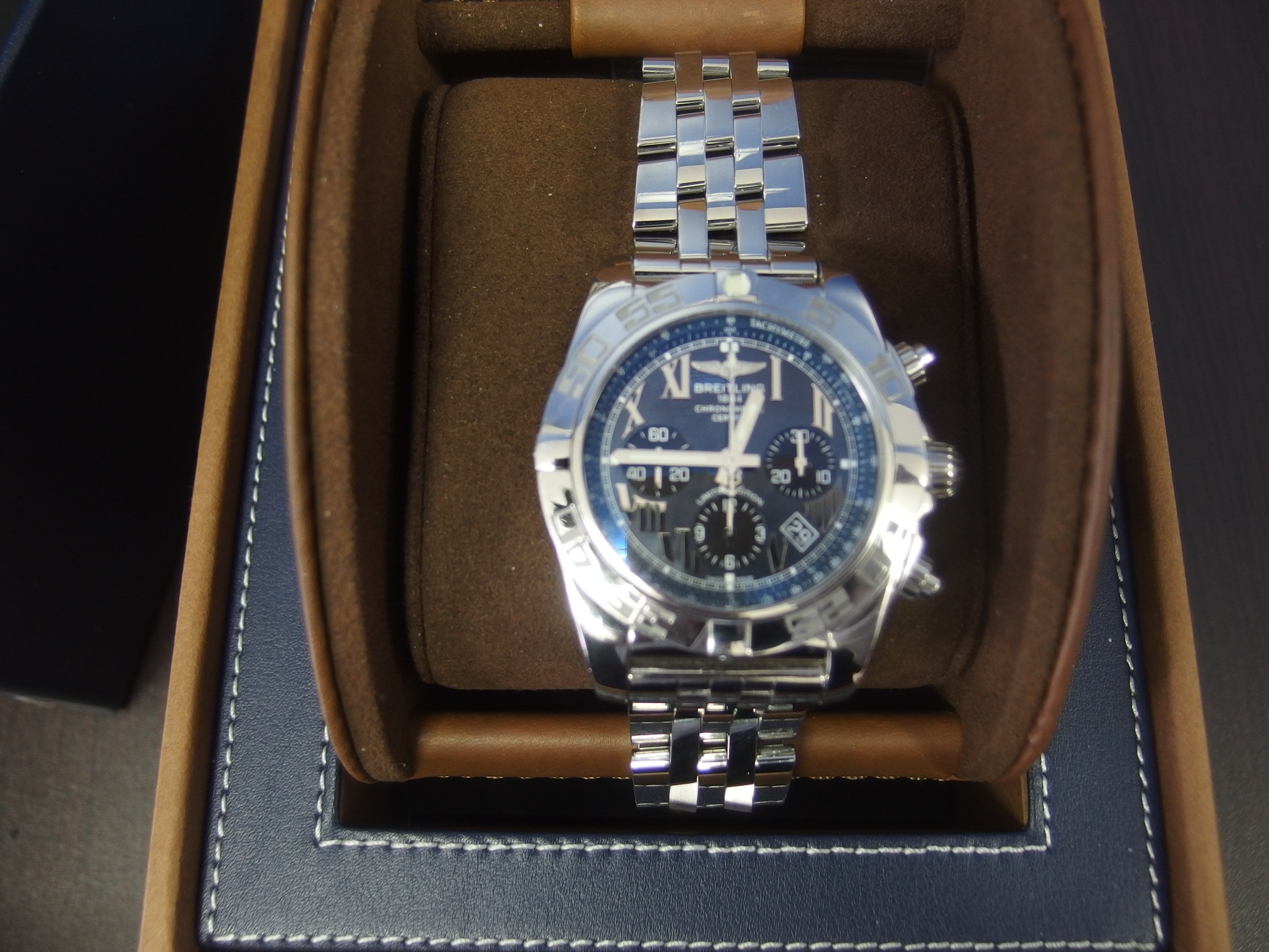 黒い文字盤の中にローマ数字の入っているブラックローマンは、ブライトリングの時計の中でもより高級さが出ていますね。