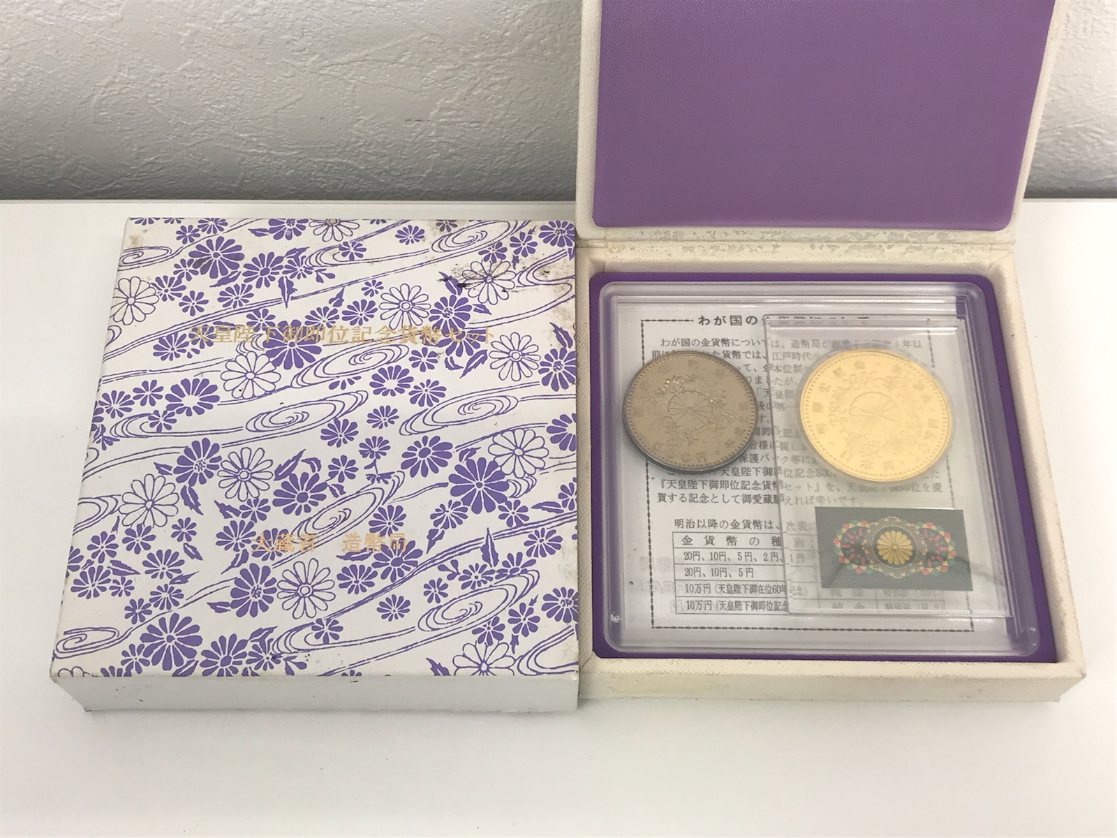 こちらは、天皇陛下御即位記念10万円金貨と500円硬貨がセットになっているものになります。