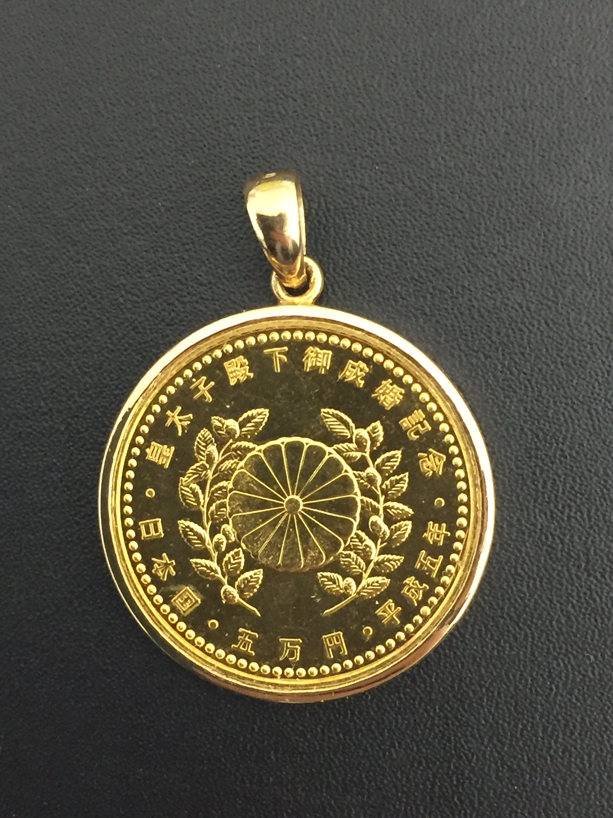 平成五年 皇太子殿下御成婚記念5万円金貨が付いているペンダントトップを