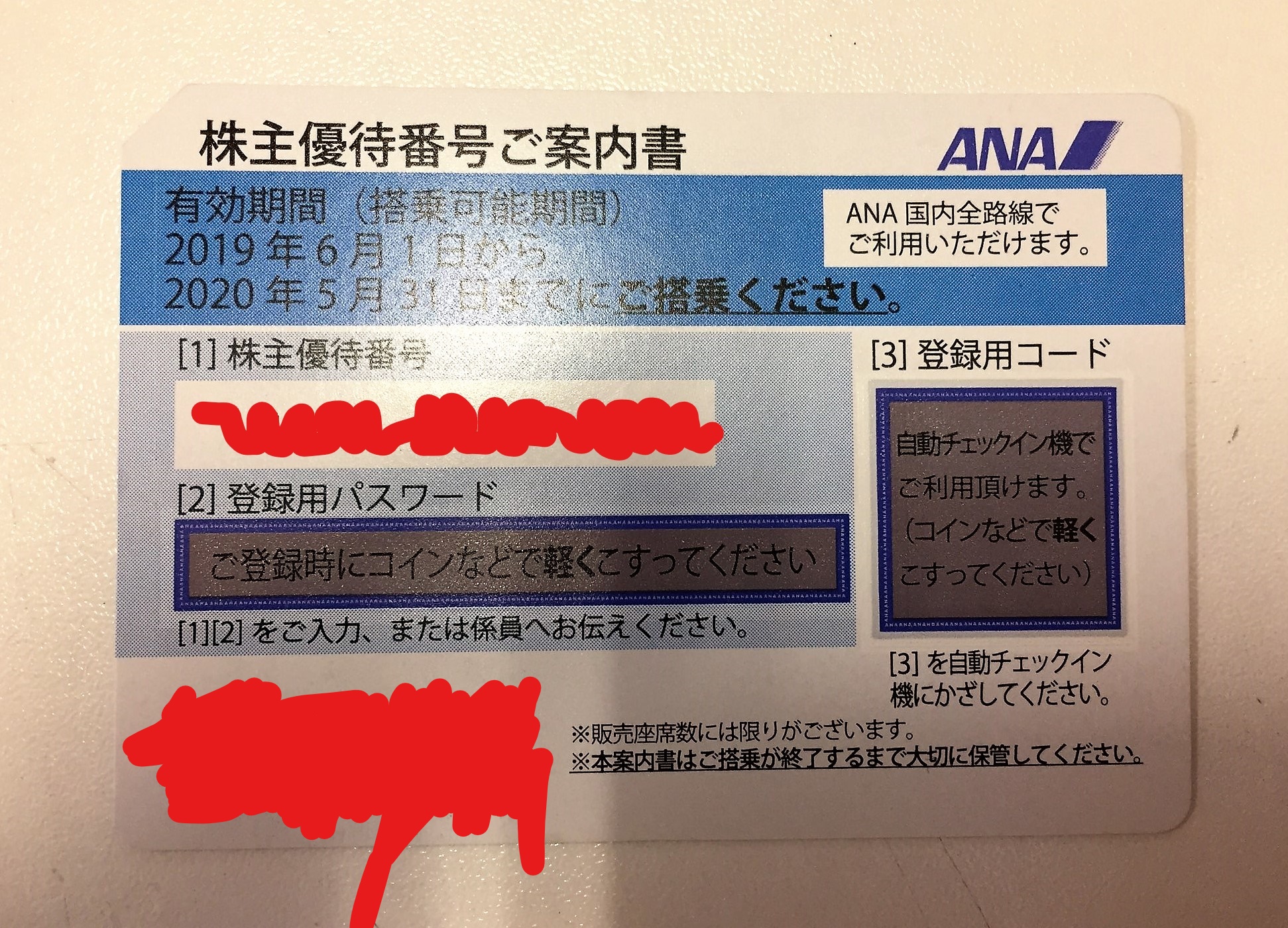 ANAの株主優待券です。セキュリティーの関係で一部画像を加工してあります。