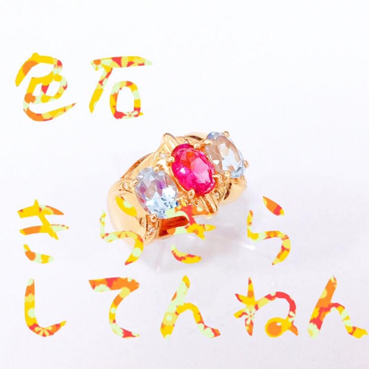 大きな色石3つと小さなダイヤが散りばめられた