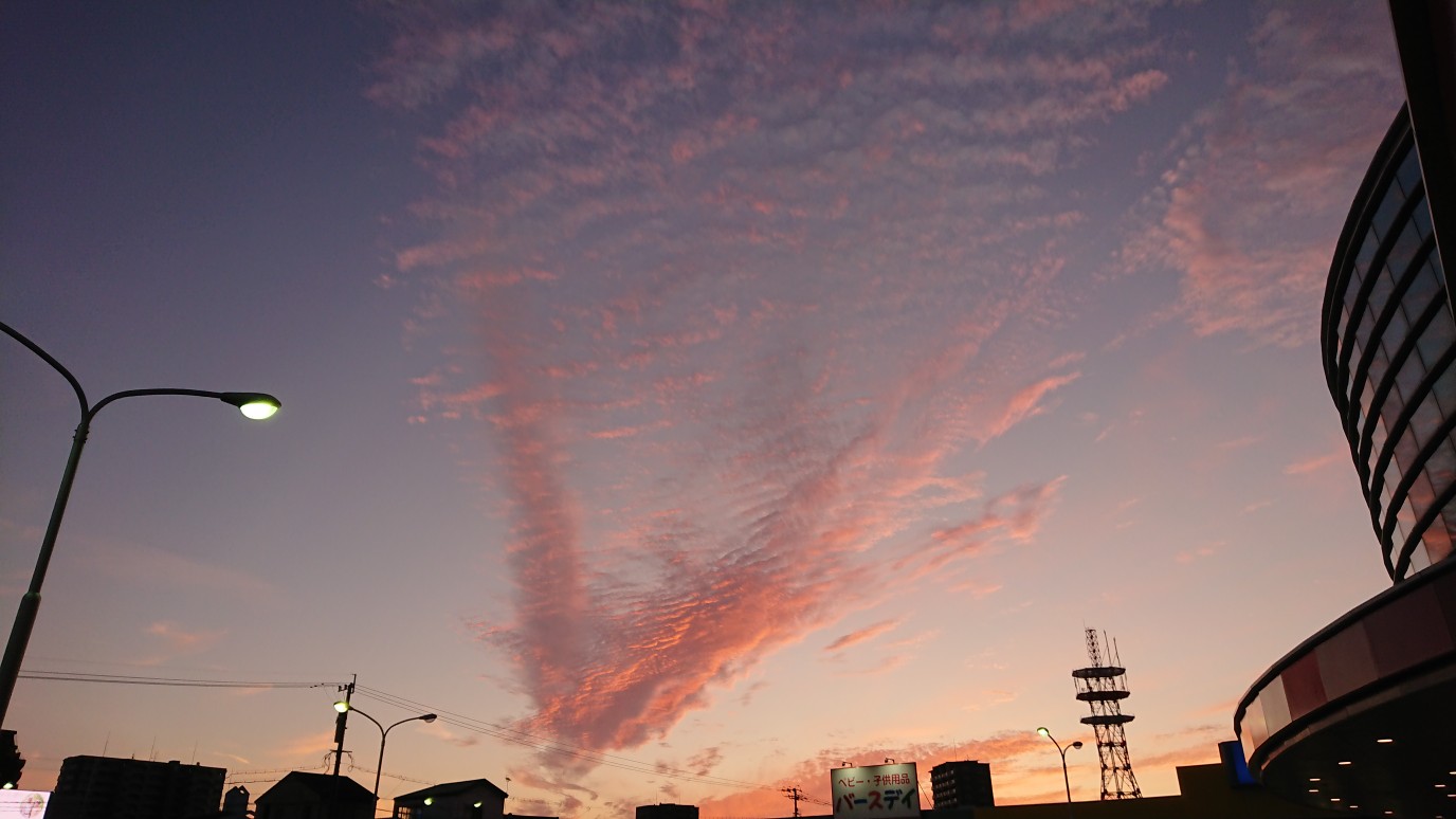 夕方に、空に「V」の字の夕焼け雲が出ていていました。