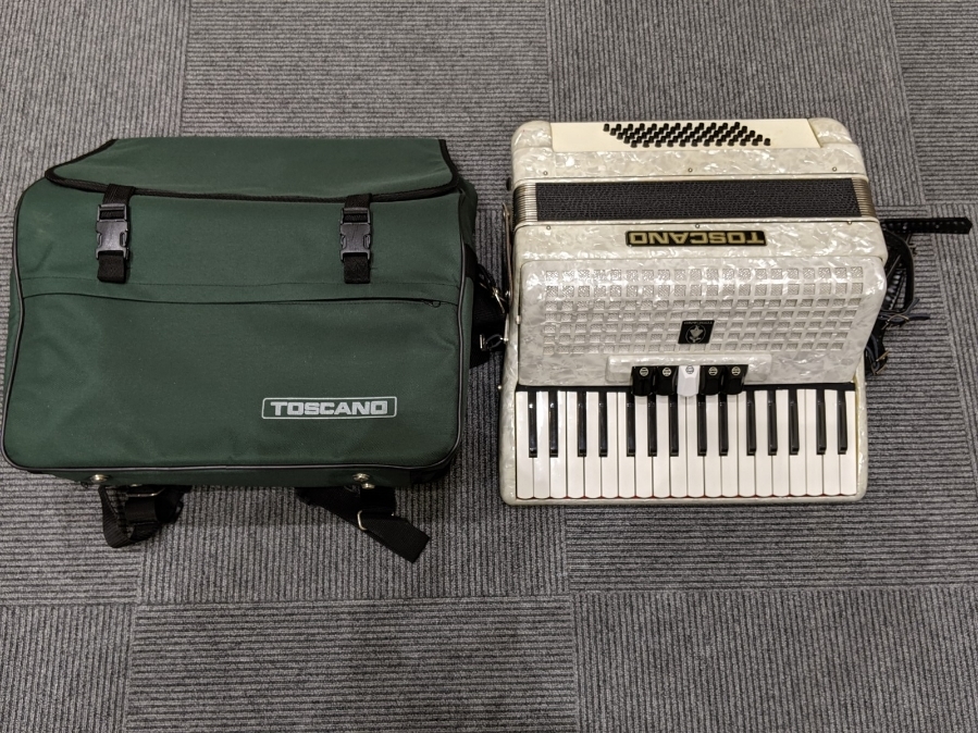 今回は 楽器 アコーディオン TOSCANO トスカーノ 34鍵盤 ソフトケース付き ホワイト です。