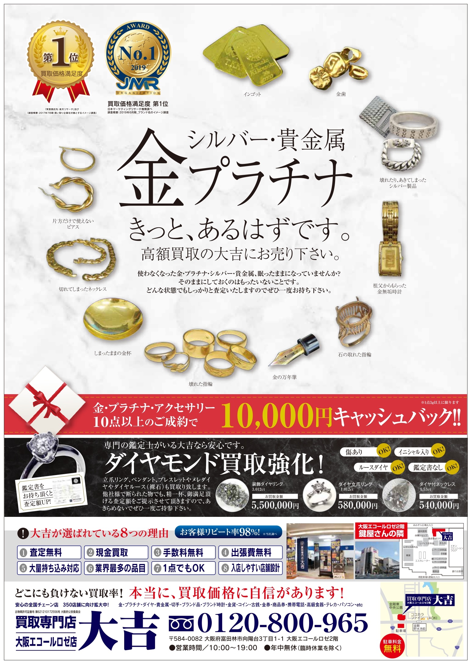 ①金・プラチナ品10点以上のご成約で10000円キャシュバック!