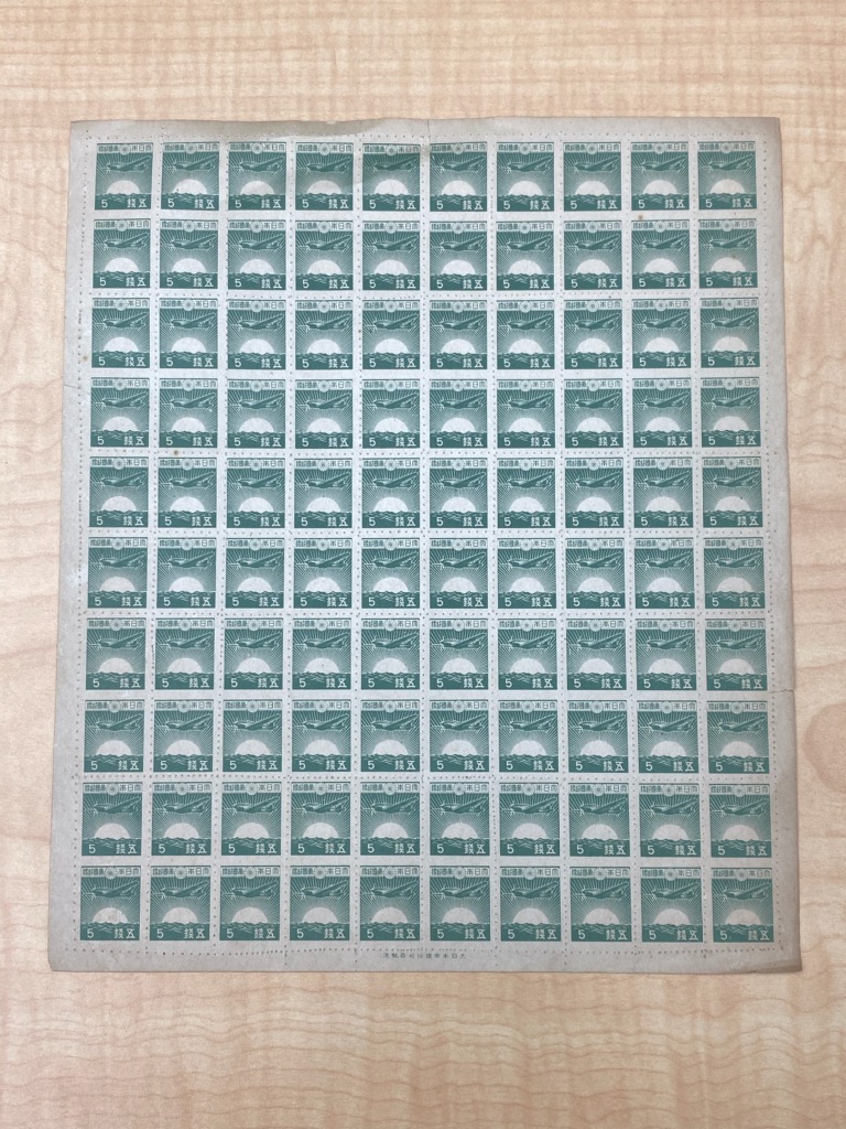こちらは『朝日と戦闘機』5銭100枚シートです。