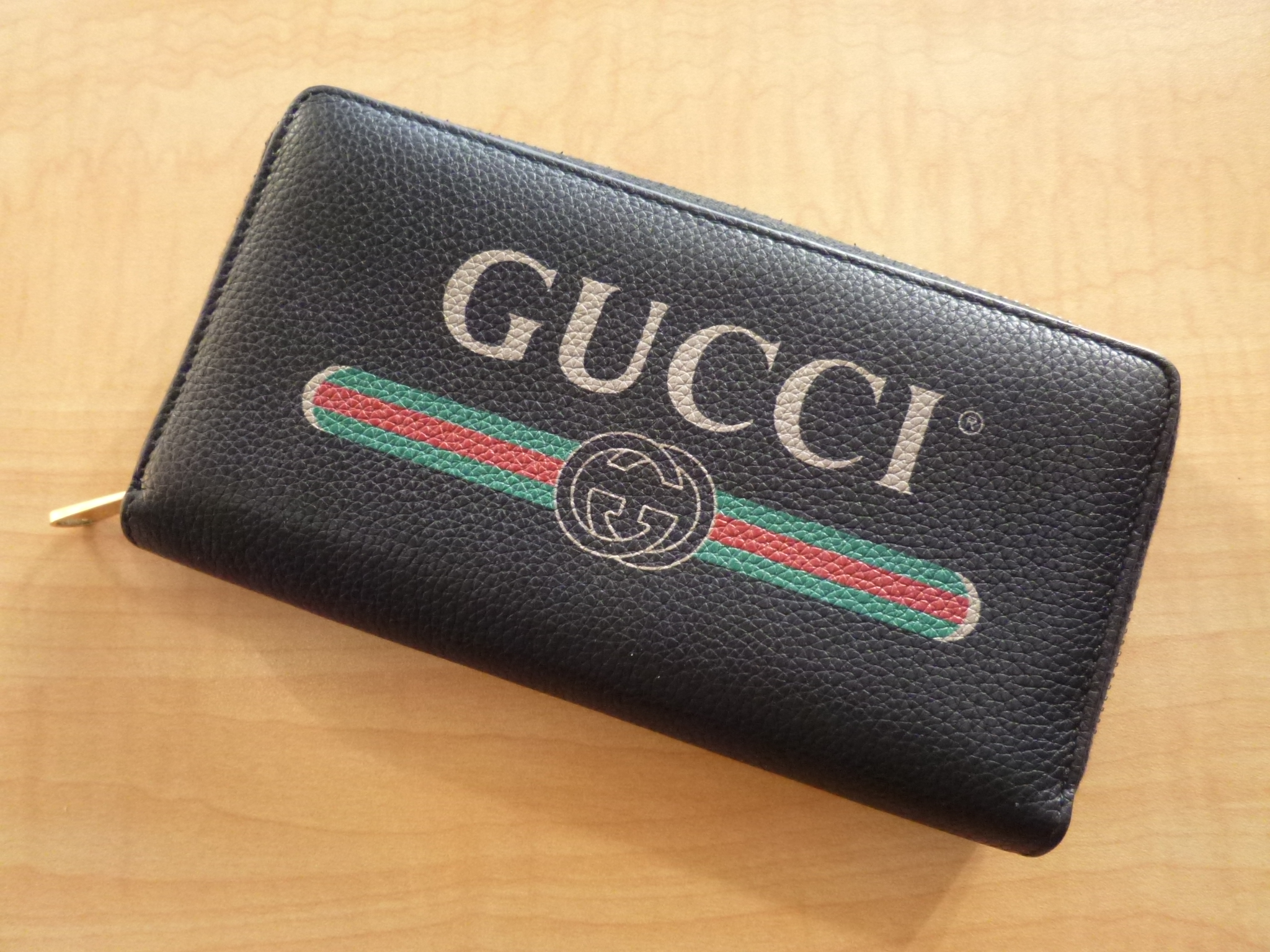 グッチのロゴがプリントされたレザーのラウンドファスナーです。