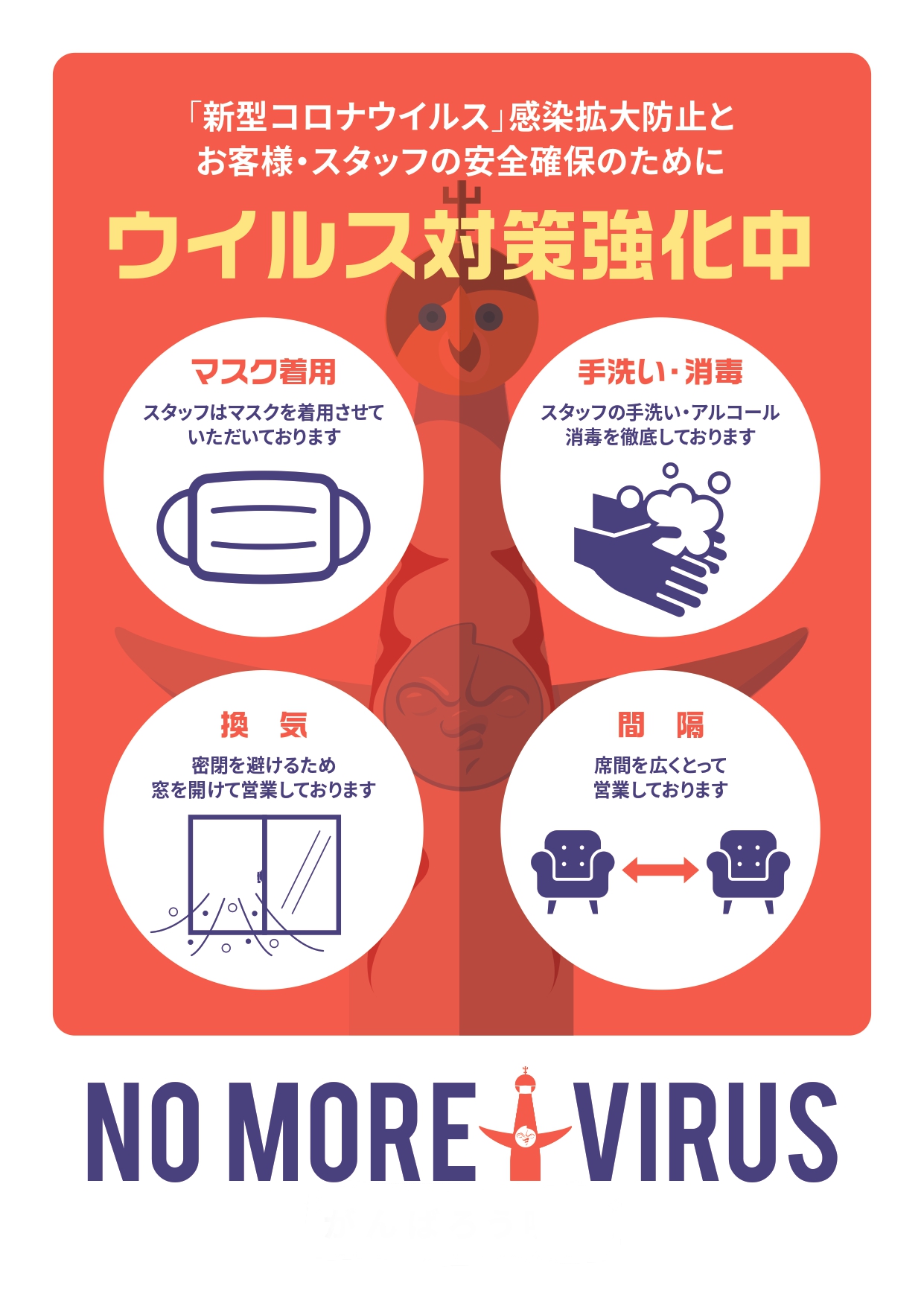 店舗内アルコール除菌、従業員マスク着用、扉を開放したままの換気を徹底し