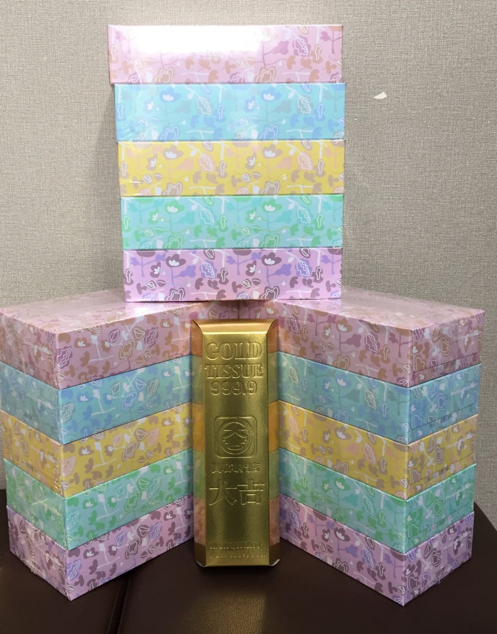 真ん中に神々しく光っている大吉特製金塊ティッシュの方は