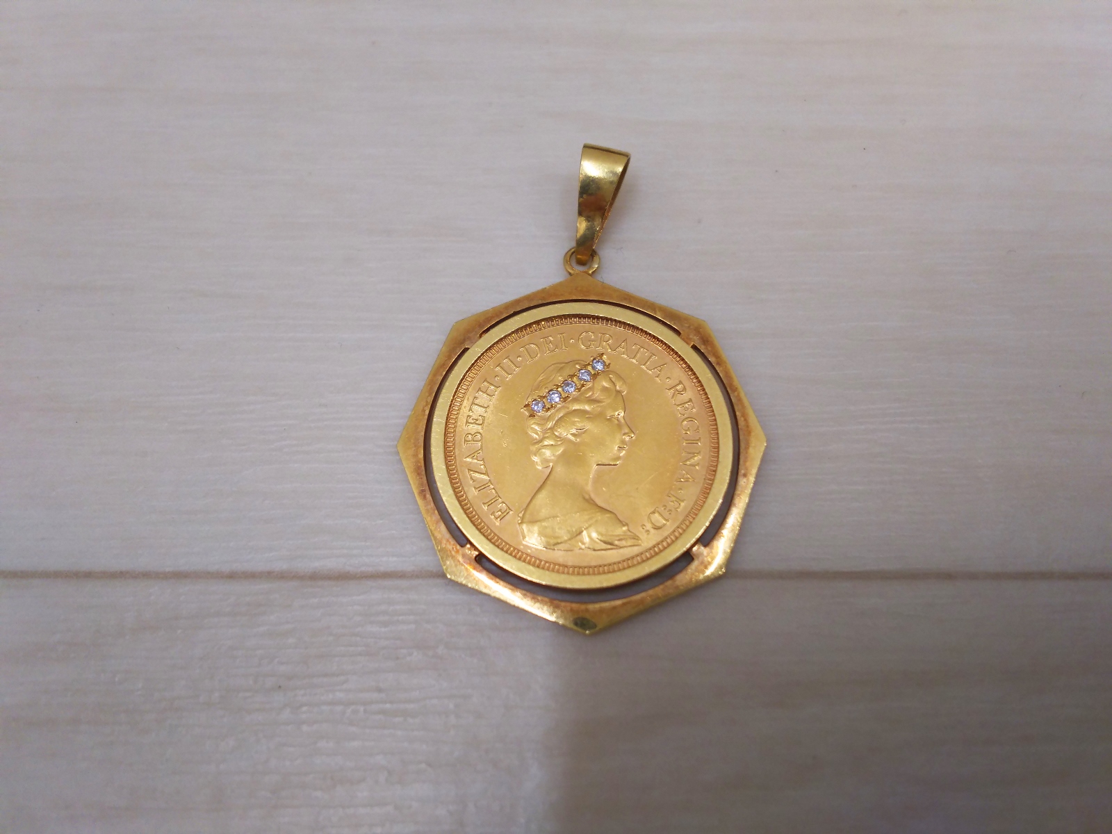 22金のダイヤモンドを装飾したエリザベス2世のソブリン金貨ペンダントトップ。