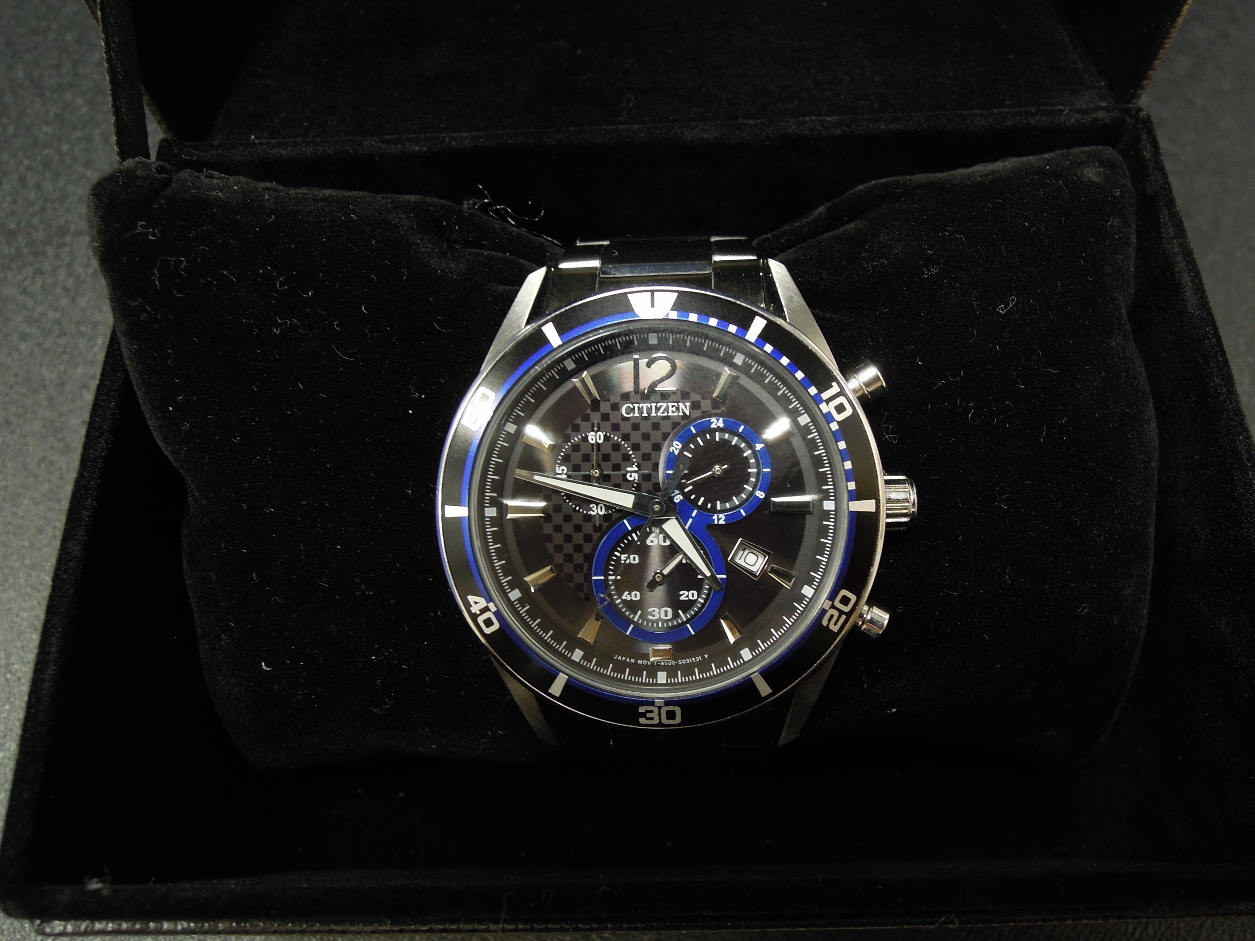 ネイビー色がかっこいいですね!シチズンエコドライブ電波時計・クロノグラフ付きです。