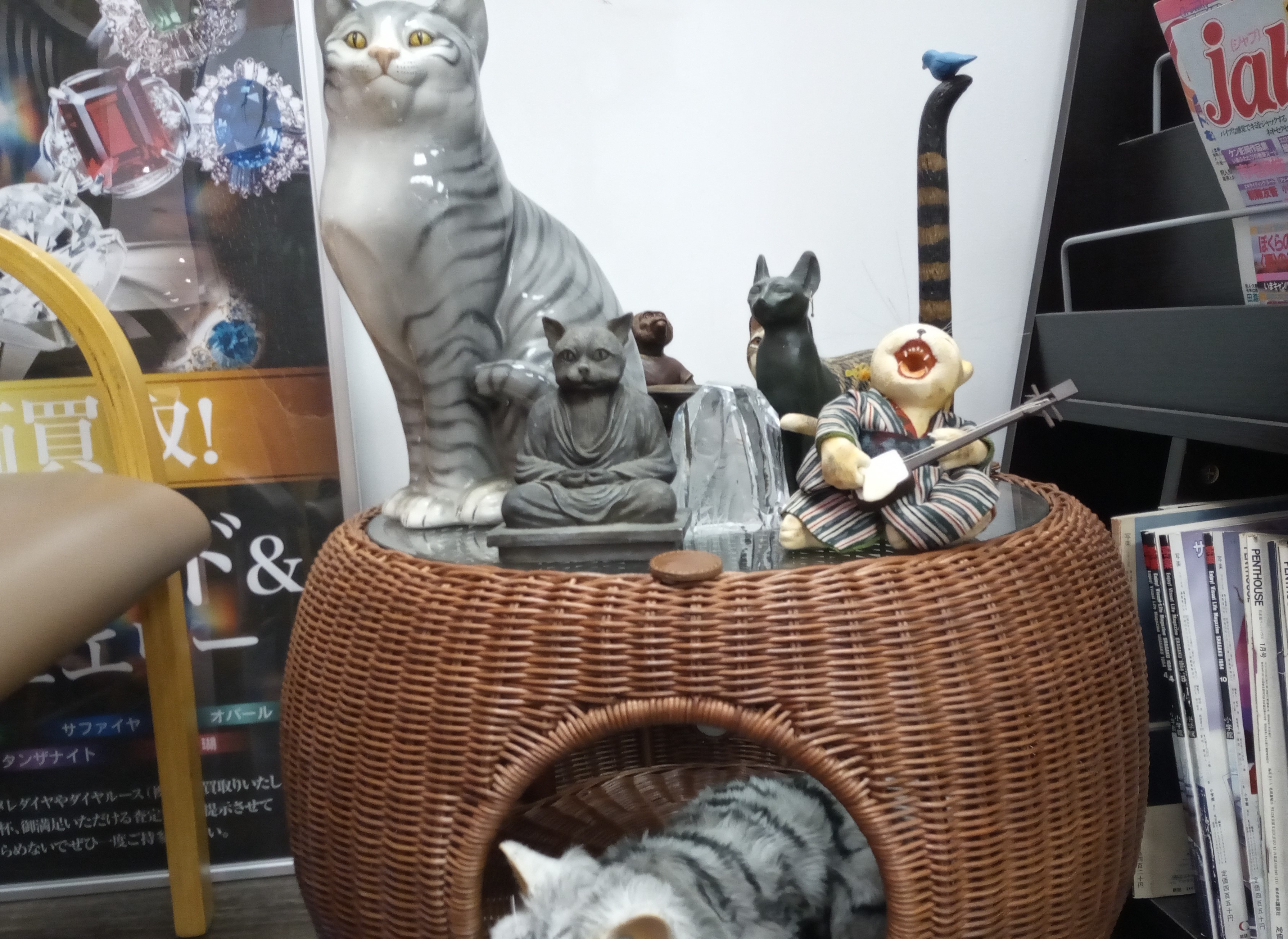 猫ちぐらテーブル、陶器の置物、クリスタルなどの猫グッズいろいろです(=^・^=)