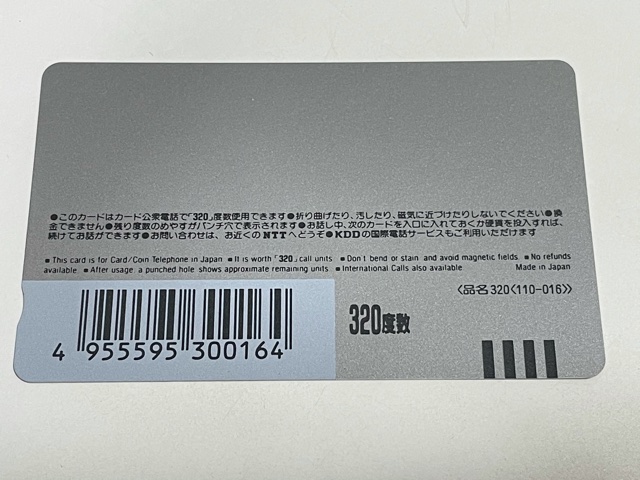 今回のテレホンカードはちょっとプレミアムがついている品物です( ゚Д゚) 上記画像を見ていただくと「320度数」と表記されているテレホンカードです。50度数や105度数などは所持している方は多いかと思いますが、320度数は流通量は多いですがコレクションしている方も多いため、高くお買取りができる一枚なんです。