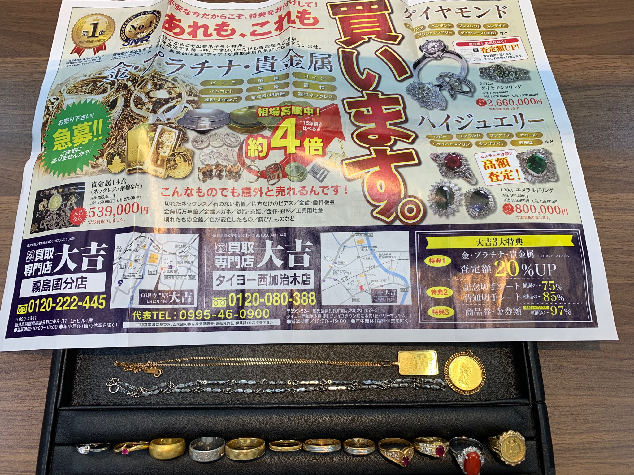 リング・リング・リング♪と唄いたくなるほど、貴金属リングを中心に本日買取の姶良市・買取専門店大吉タイヨー西加治木店!