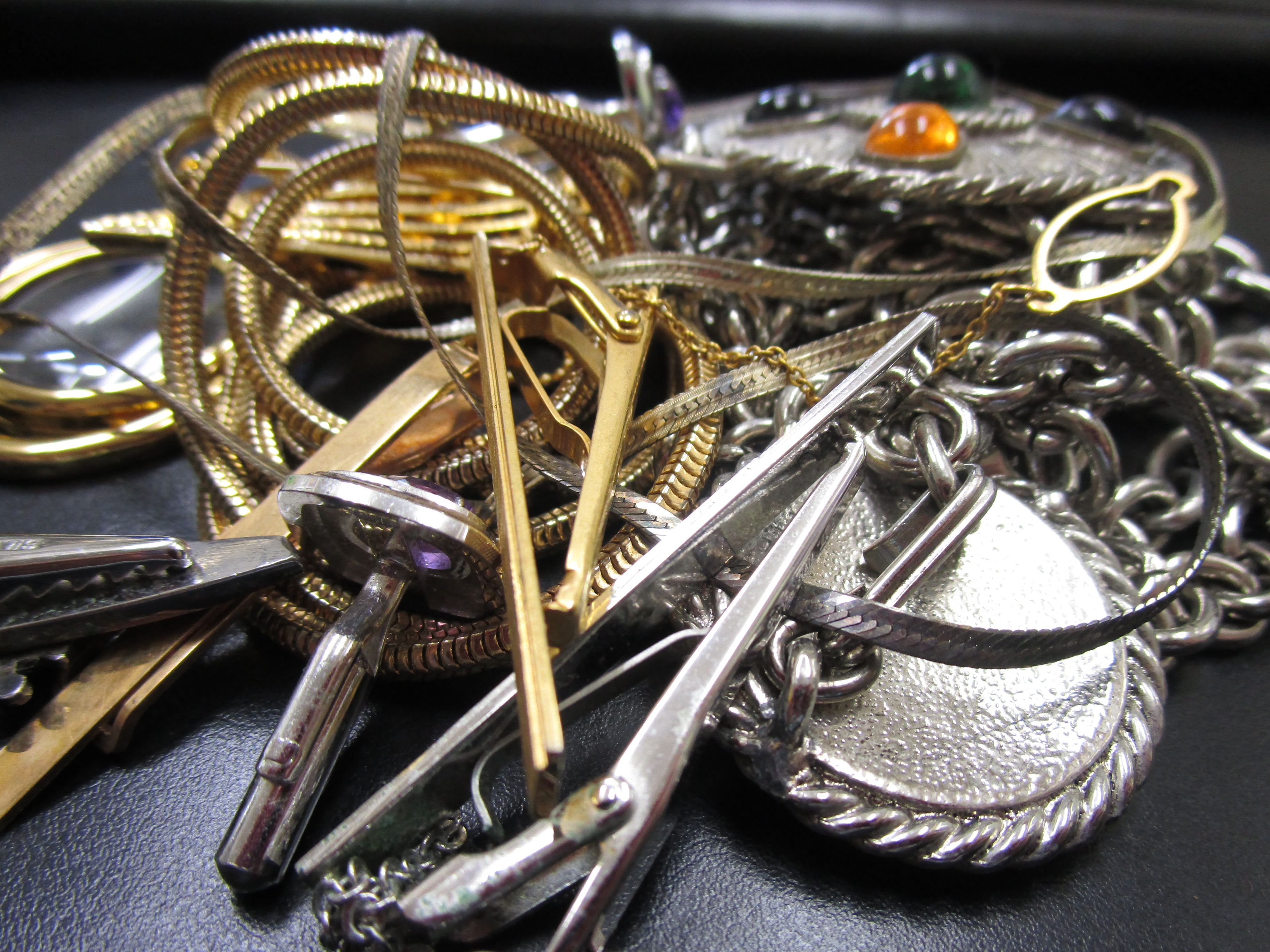 アクセサリーの山から探し出しましたK18のタイピン、K14のピアス、プラチナリング、シルバーのネックレスなどなど。