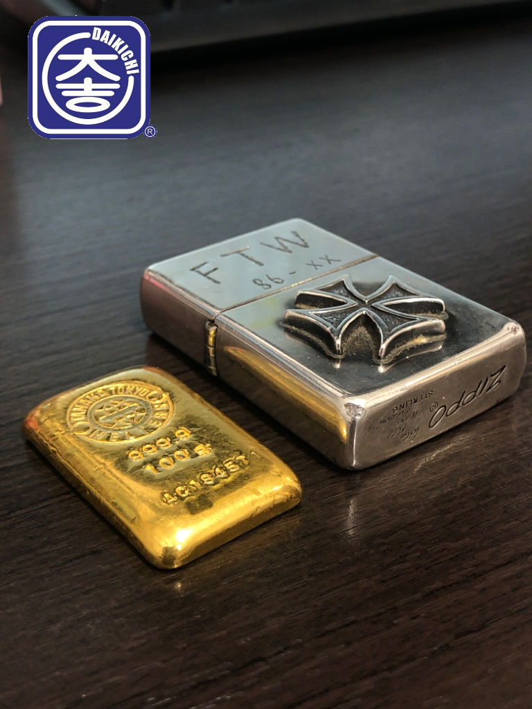 大きさの比較で隣にZIPPOライターを並べてみましたが、半分以下の大きさで100gもあります。