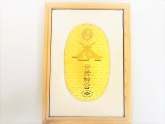 作られた小判型メダルになります。表面には、伊勢神宮と記され、紋章と社殿が描かれています。
