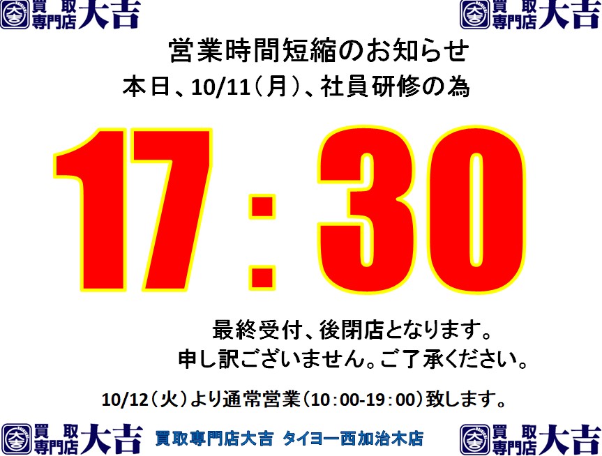 姶良市・買取専門店大吉タイヨー西加治木店より10/11(月)営業時間変更のお知らせ | タイヨー西加治木店