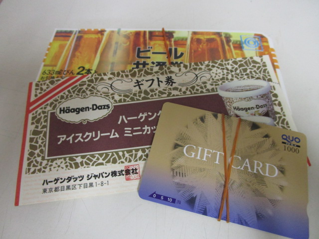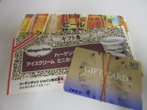 各種ギフト券、商品券、グルメ券、優待券、ビール券、おこめ券、図書券に図書カード。