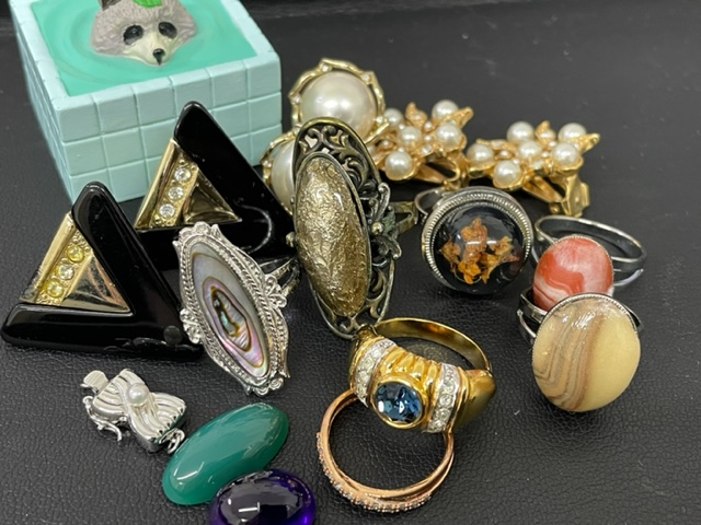 外れた石、壊れたイヤリング、素材がわからない指輪