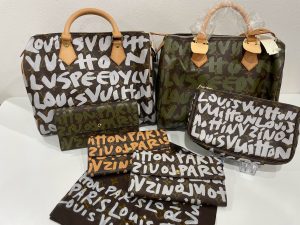グラフィティは伝統のモノグラム・キャンバスにグラフィティ(落書き)を施したものと、 カーフ素材に大きなグラフィティ(落書き)を施した2種類。グラフィティはマーク・ジェイコブスが友人の女優シャルロット・ゲンズブールの家にあった、 落書きをされたモノグラムのトランクからインスピレーションを受け、その後、友人のスティーブン・スプラウスにペイントを依頼し誕生したと言われています。