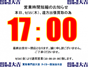 本日9/15(木)は遠方地域への出張買取の為