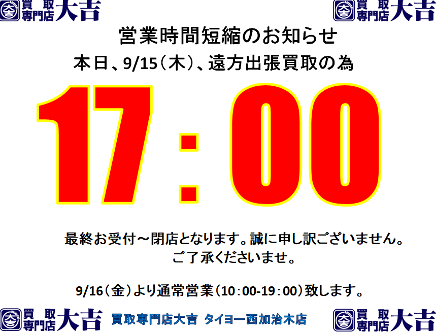 2022年9/15の姶良市・買取専門店大吉タイヨー西加治木店より、営業時間変更のお知らせ | タイヨー西加治木店