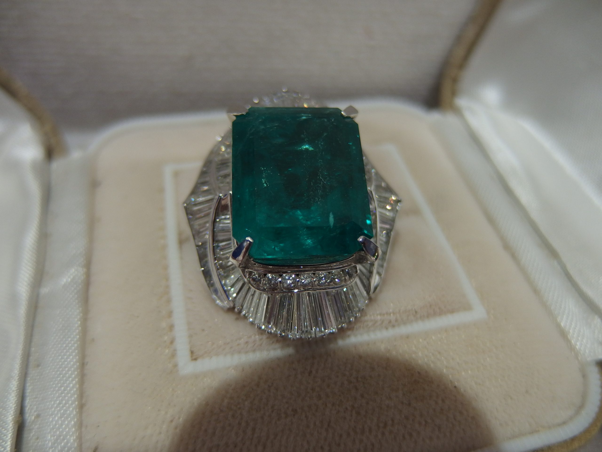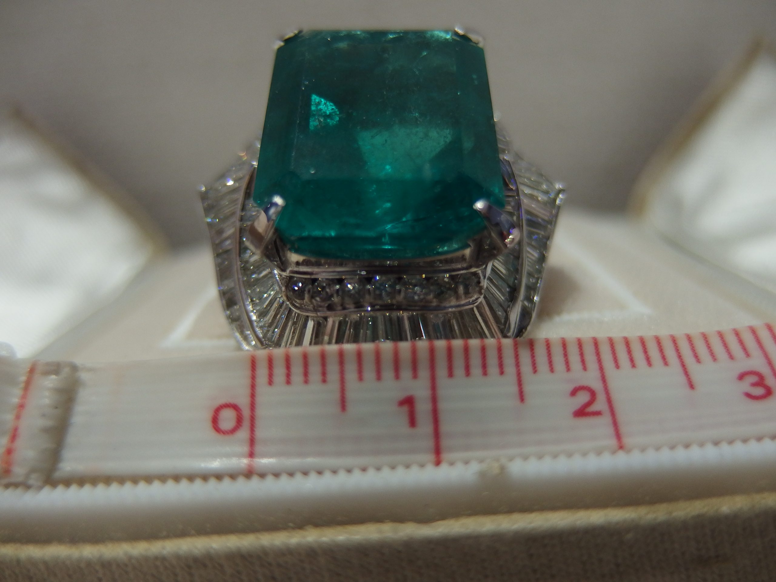 20.16カラットの天然エメラルドと3.65カラットのダイヤモンドが付いたプラチナの指輪です。