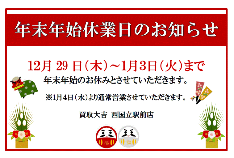 さて、買取大吉西国立駅前店では年末年始の休業日につきまして
