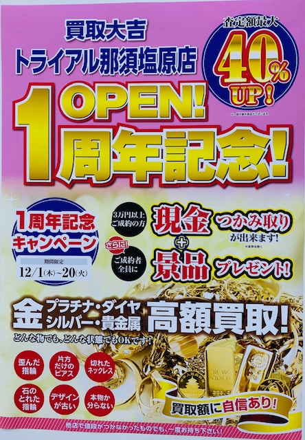 12/20今日まで一周年記念キャンペーンを行っております!! 那須塩原 那須 黒磯 さくら市 大田原 矢板 烏山 佐野 宇都宮 栃木県 白河 西郷 泉崎 矢吹 塙 棚倉 福島県 | トライアル那須塩原店