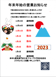 年末年始休暇のお知らせ 京田辺市田辺中央にあります大吉 アル・プラザ京田辺店です。 | アル・プラザ京田辺店