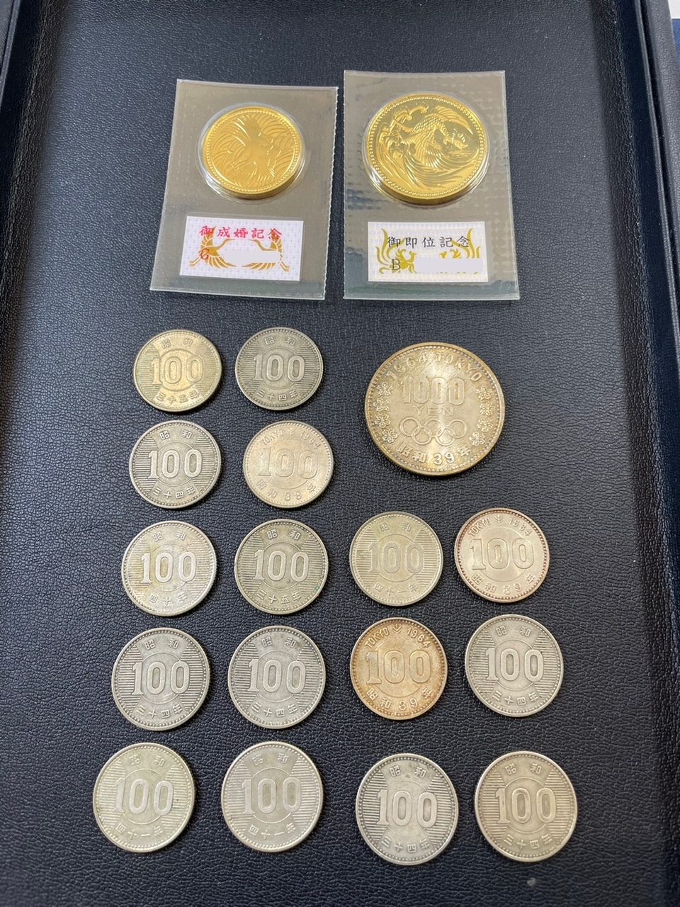 お品物は 御即位金貨・御成婚金貨・東京オリンピック記念1,000円銀貨・100円銀貨 でございます。