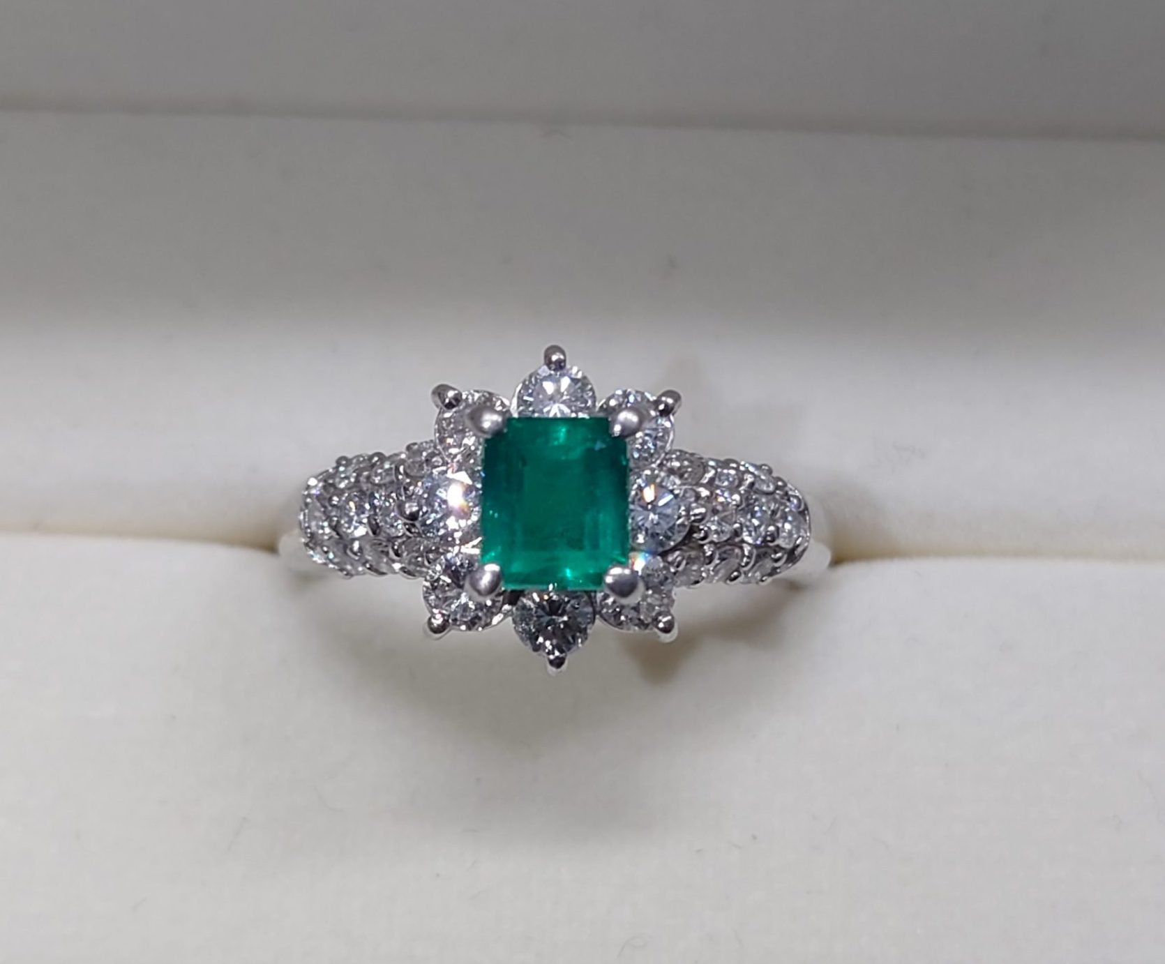 土台はプラチナで、エメラルの周りにダイヤモンドも散りばめられていたので高価買取させて頂きました!