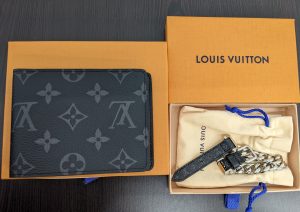 『ルイヴィトンの二つ折り財布「モノグラム・エクリプス ポルトフォイユ・ミュルティブル」とブレスレット』です。