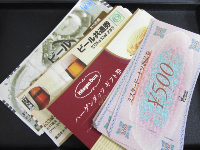 各種ギフト券、商品券、グルメ券、優待券、ビール券、おこめ券、図書券に図書カード。
