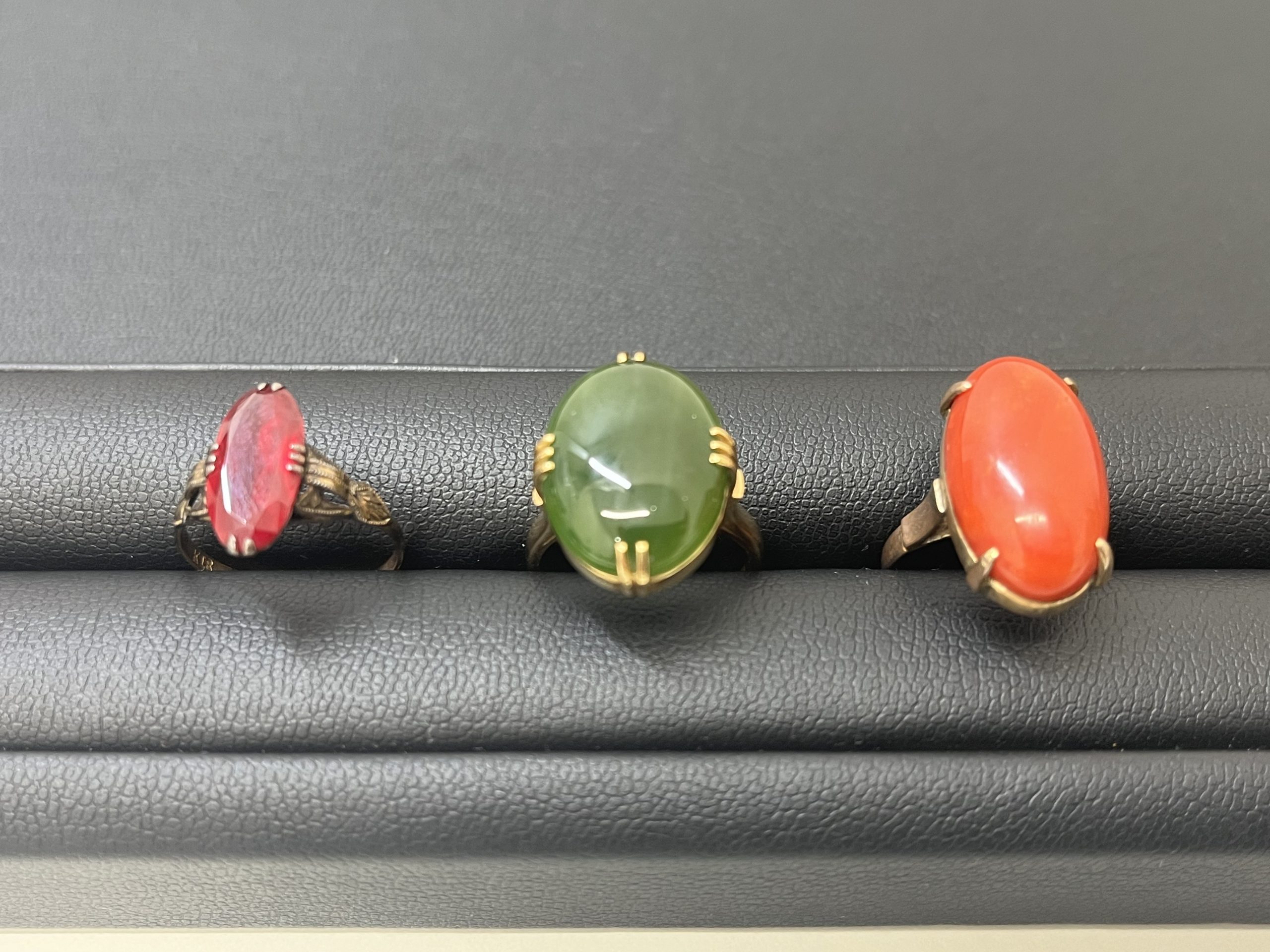 それぞれ金製で、ガーネット、翡翠、珊瑚の指輪です。