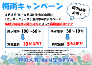 毎朝9時時点のウェザーニュース立川市のページにて表示されている降水確率によって買取金額がUPします⤴⤴
