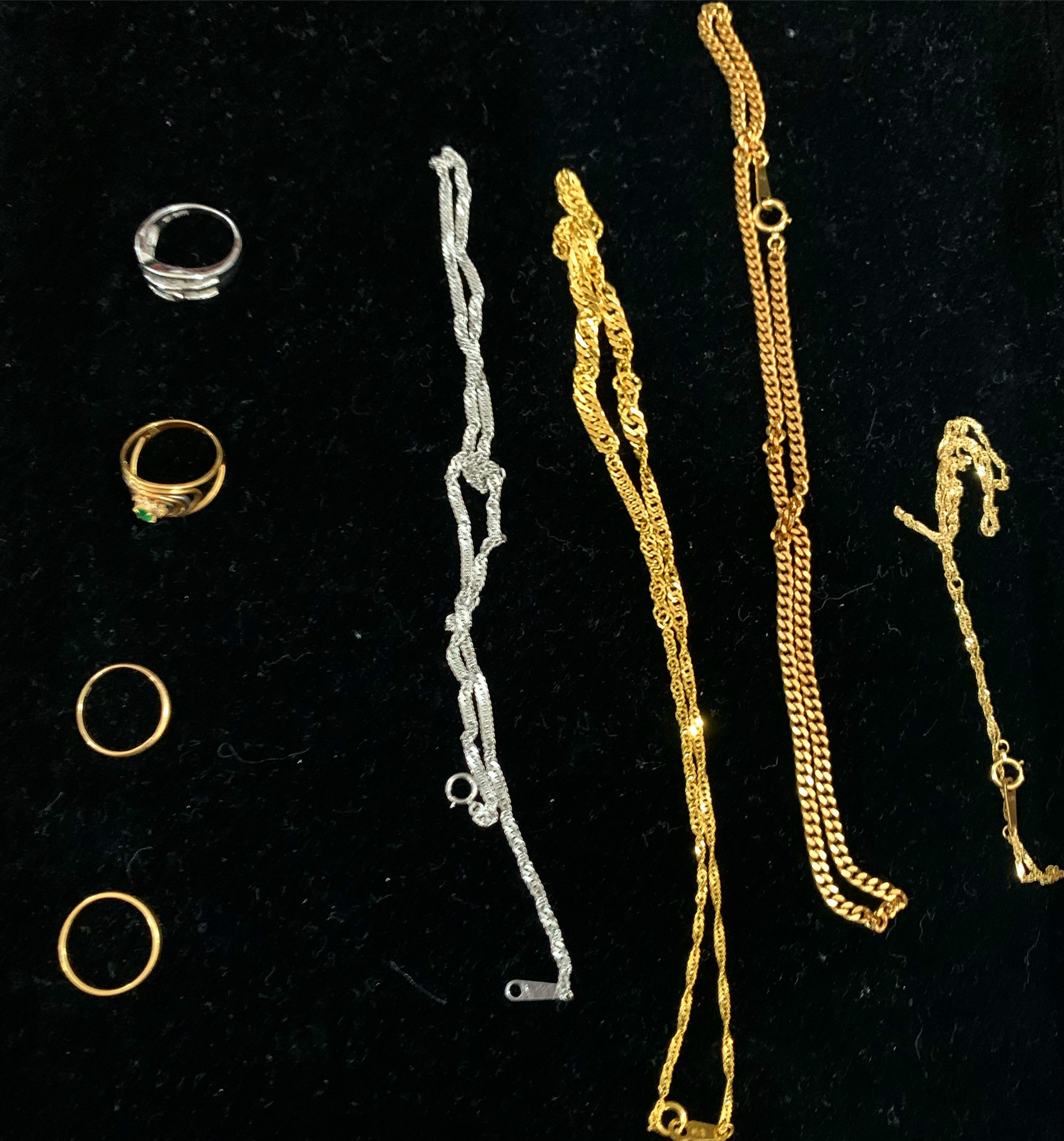 本日は純金(24金)、18金、純プラチナ(Pt1000)のネックレスと金、プラチナコンビリング、18金リング、プラチナリングなどご夫婦で諸々お持ちいただきました。