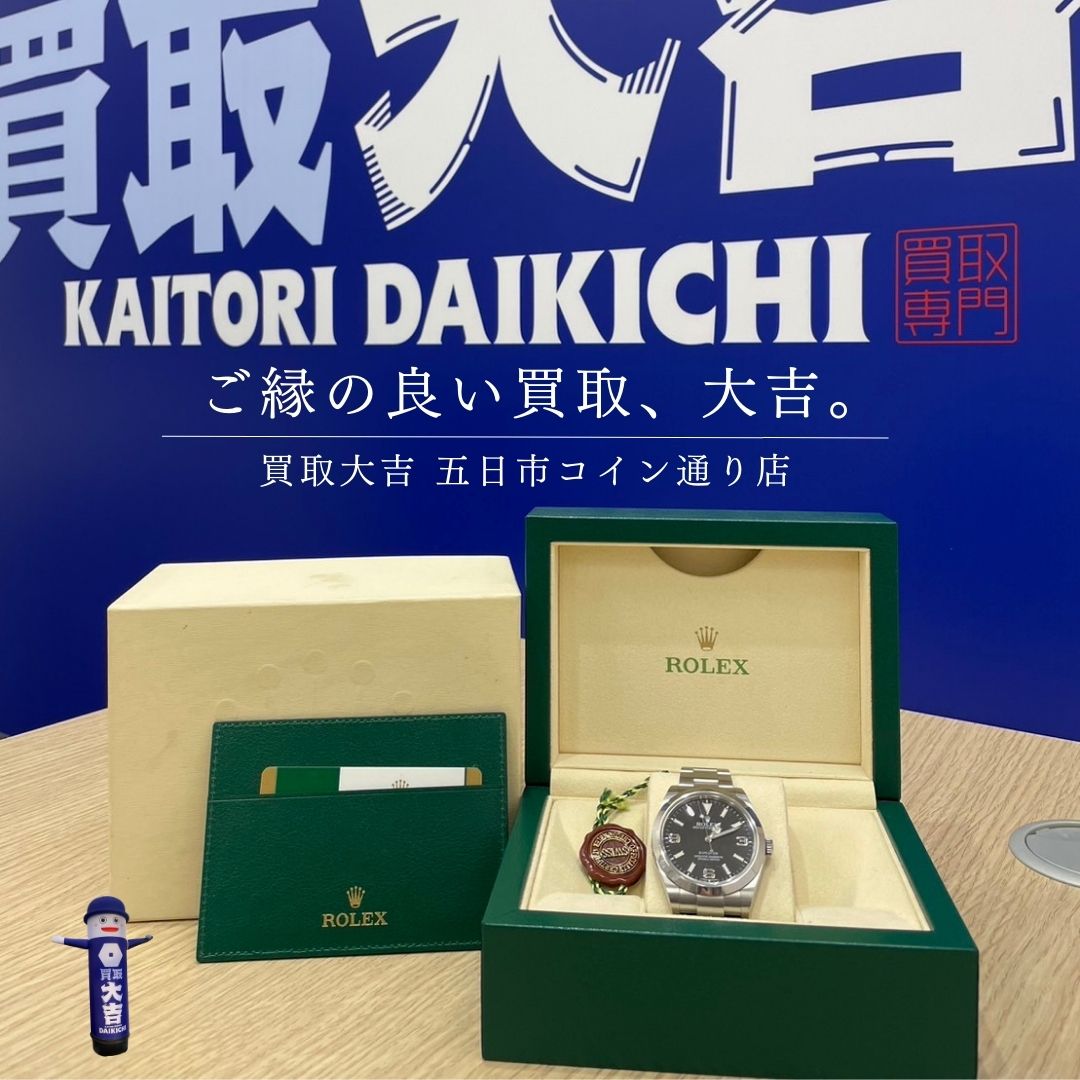 <買取に持っていくキッカケは?> リピーター様からの紹介でご来店。 🔷――――――――🔷 ロレックスは1905年創業の スイスの高級腕時計メーカー。 ロレックスの時計の特徴✨ ■オイスターケース:防水に優れたケース ■パーペチュアル:自動巻き機構 ■デイトジャスト:日付切替機能 ロレックスの時計で 高価買取が期待できるモデル⭐ ⌚デイトナ ロレックスの中で唯一、 クロノグラフ(ストップウォッチ機能) 機能搭載モデル。 実用性の高い機能と防水性も優れている。 デザイン展開が豊富。 ⌚サブマリーナ マリンスポーツを楽しむ方にオススメ。 100〜300mの水深に耐えられる。 耐蝕性、耐傷性に優れているため、 長時間海水に浸かっていても、 傷付きにくくなったいる。 ⌚エクスプローラー 探検家のために作られたモデル。 過酷な環境でも動き続け、 正確な時間を表示することができる 耐久性がとても高いスポーツウォッチ。 🔷――――――――🔷 大切にしてきたモノをしっかり鑑定いたしますので 品数が多い時・外出できない時・整理目的で まとめて見て欲しい時もご相談下さい。 国内外の豊富な販売ルートと、 BtoB専門の自社オークションサイトを 運営している買取大吉なら、 他社圧倒の"高価買取"を実現できます! 広島県広島市佐伯区五日市にある 【買取大吉 五日市コイン通り店】は、 金買取・貴金属買取・ダイヤ買取・ ブランドバッグ買取・ブランド時計買取なら お気軽にご相談ください! 金・貴金属・ダイヤモンド・ ブランドバッグ・時計はもちろん 切手・洋酒などのお酒・着物や骨董品等、 「こんなもの売れるかな...?」とお考えの品物まで、 すべて無料査定させていただきます! 一般的にかかってしまう査定料・出張査定料・手数料 全て無料でお買取りさせていただいており、 キャンペーン等も行っておりますのでお見逃しなく。