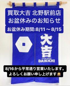 買取大吉» 店舗紹介» 北野駅前店» 北野駅前店 店長ブログ» お盆休みのお知らせ