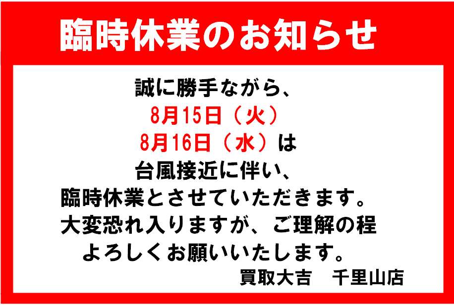 買取大吉 千里山店 台風7号に伴う臨時休業のお知らせ | 千里山店