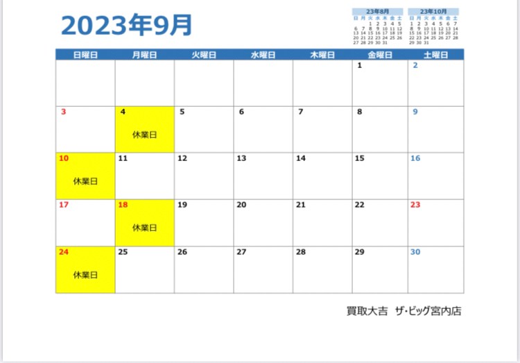 広島県 廿日市市 買取大吉 ザ・ビッグ宮内店 9月営業日カレンダー | ザ・ビッグ宮内店
