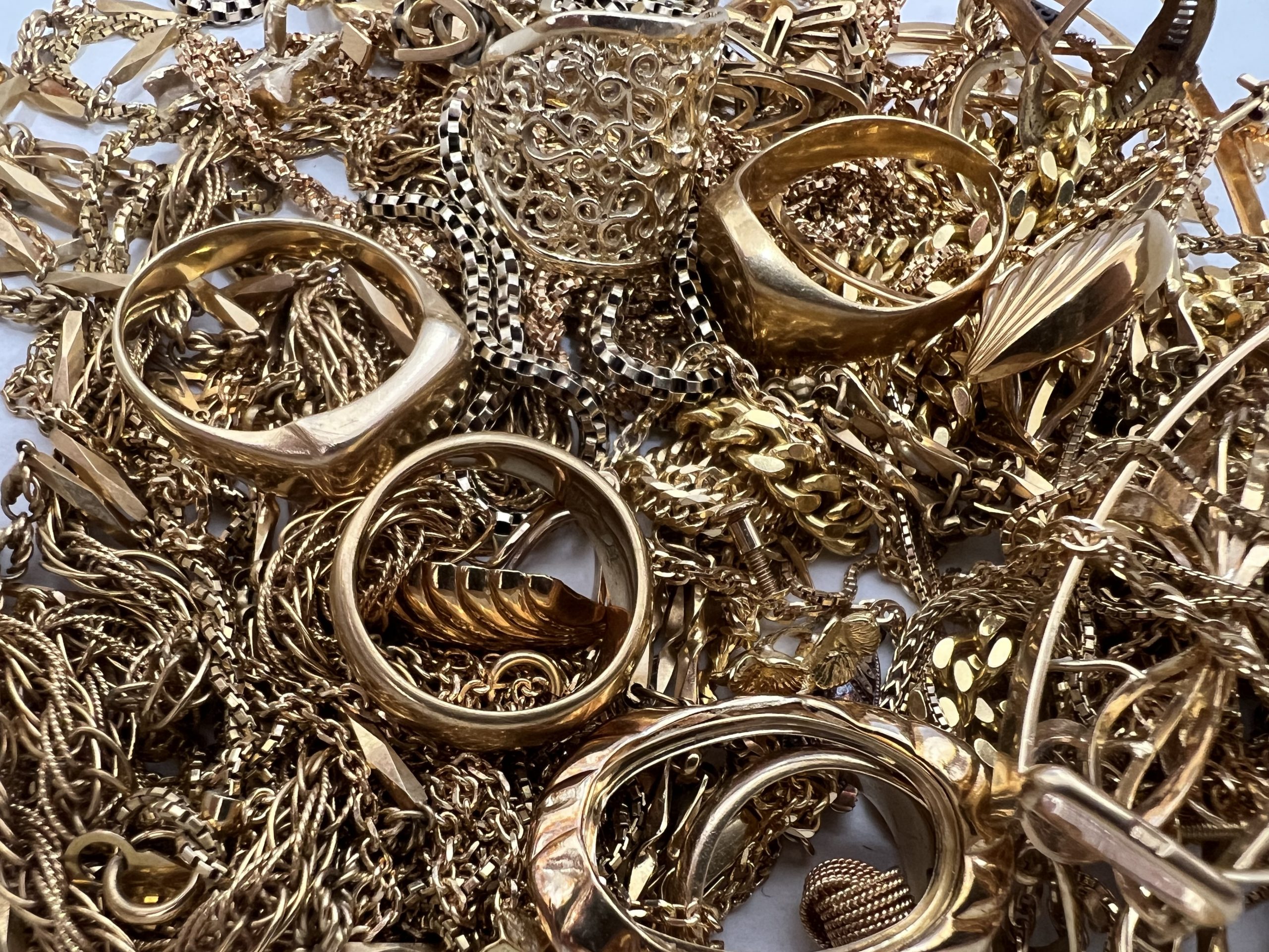 金 ネックレス・リング大量にをお買い取りいたしました。金リング以外にも、ダイヤモンド、ルビー、サファイア、エメラルド、プラチナ、金、リング、ネックレス、ブレスレット、今は必要ない、使用していない、サイズが合わない、デザインが古い、石が取れている、片方しかない、チェーンが切れている、イニシャル入り、不要になった貴金属はありませんか?鑑定書がなくても貴金属なら何でも買い取りいたします。まだまだ高騰中の金、プラチナ、貴金属、ジュエリー、査定、ご相談は無料ですよ!