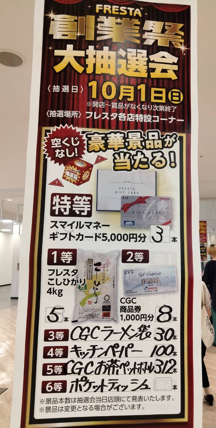 昨日、今日とフレスタモールカジル津島さんではFRESTA創業祭大抽選会を開催されていて、オープンから沢山のお客様で賑わっております。