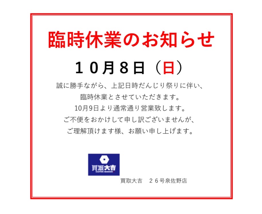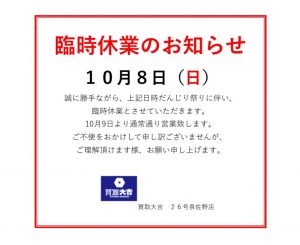 臨時休業のお知らせ | 26号泉佐野店