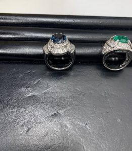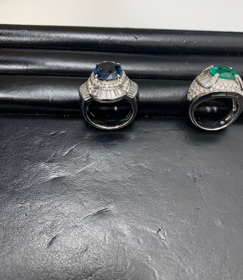 プラチナとサファイア、プラチナとエメラルドのリングです。
