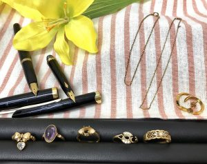 他のリングは一部の石が取れていたり、万年筆の胴部分がなくなっていたりもしましたが、このように壊れていても、金としてのお買取りは可能ですのでご安心ください。
