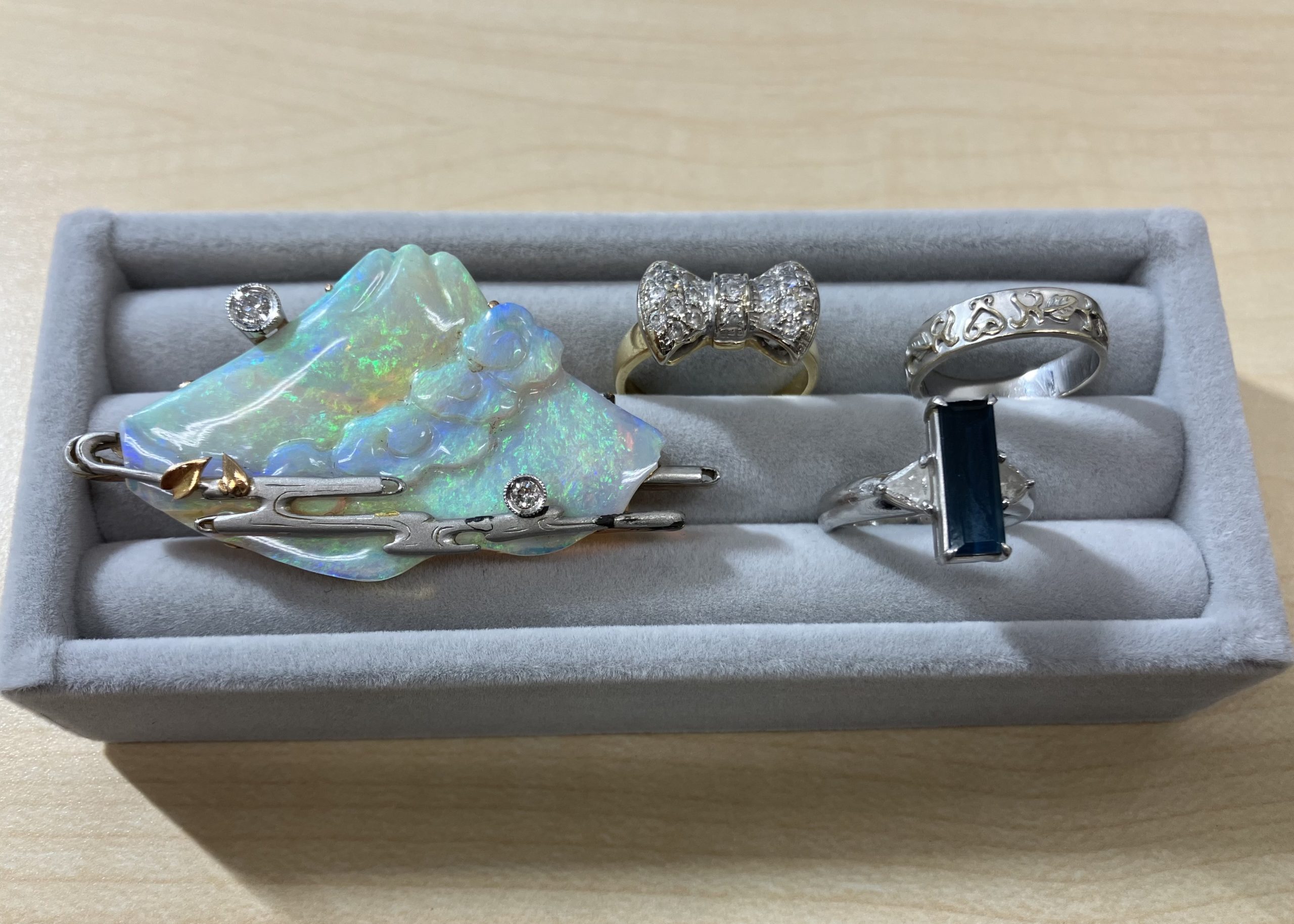 大変珍しいオパールを富士山の形に加工した帯留め。そのほか海外デザインに一目惚れして購入されたリング。